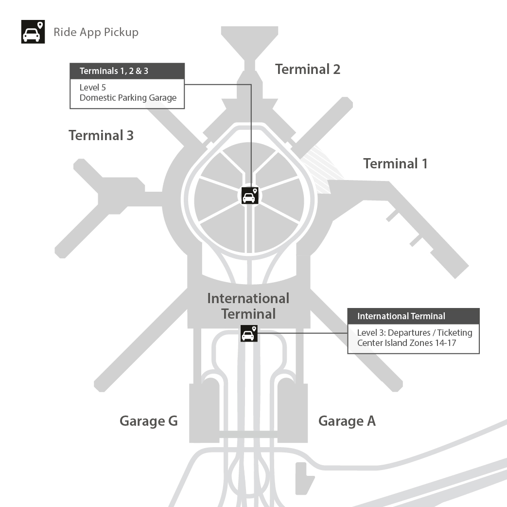 At the International Terminal, Lyft, Uber, Wingz and YRide pick-ups are located at the Departures/Ticketing Level roadway center island, at Pick-Up/Drop-Off zones 14-17.